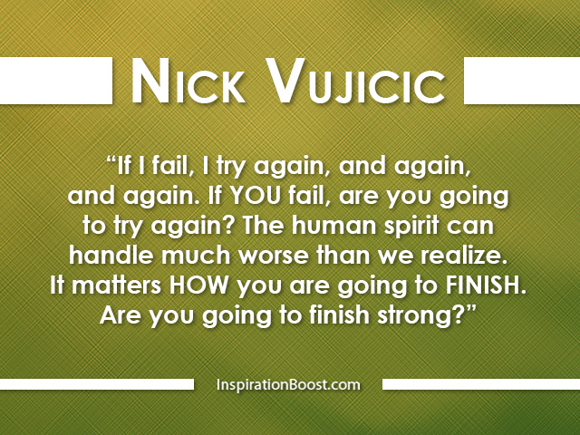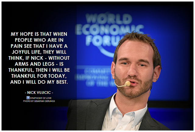 Nicholas James Vujicic is an Australian Christian evangelist and motivational speaker born with Phocomelia, a rare disorder characterized by the absence of all four limbs. As a child, he struggled mentally and emotionally as well as physically, but eventually came to terms with his disability and, at the age of seventeen, started his own non-profit organization, Life Without Limbs. Vujicic presents motivational speeches worldwide which focus on life with a disability, hope and finding meaning in life... (wikipedia)