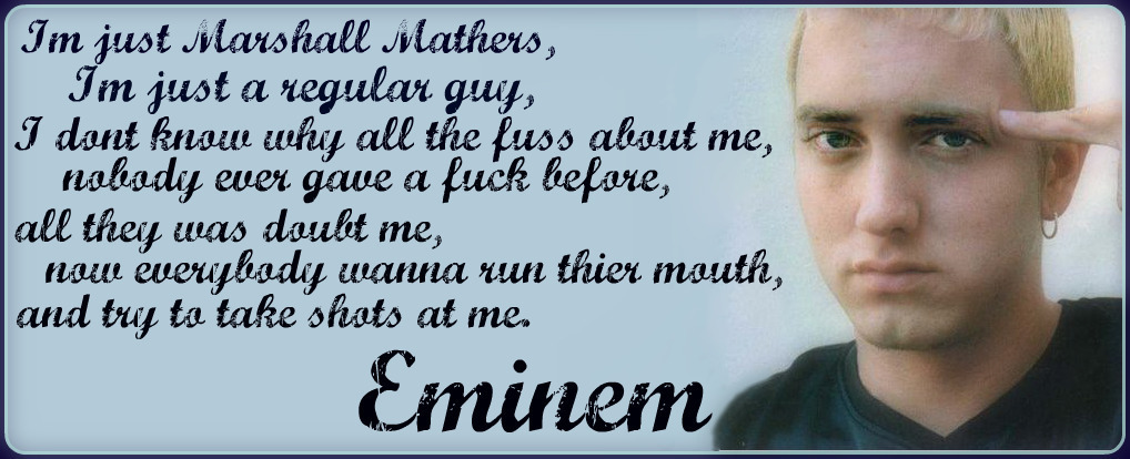 Marshall Bruce Mathers III, better known by his stage name Eminem, is an American rapper, record producer, singer and songwriter from Detroit, Michigan... (wikipedia)