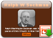 Ralph Washington Sockman was the senior pastor of Christ Church in New York City, United States. He gained considerable prominence in the U.S. as the featured speaker on the weekly NBC radio program, National Radio Pulpit, which aired from 1928 to 1962, and as a writer of several best-selling books on the Christian life.Time Magazine reported in 1946 that Sockman's National Radio Pulpit program received 4,000 letters weekly, making him "the number one Protestant radio pastor of the U.S. ...rated by volume of fan mail". Fifteen years later in 1961, Time said that Sockman was "generally acknowledged as the best Protestant preacher in the U.S."... (wikipedia)