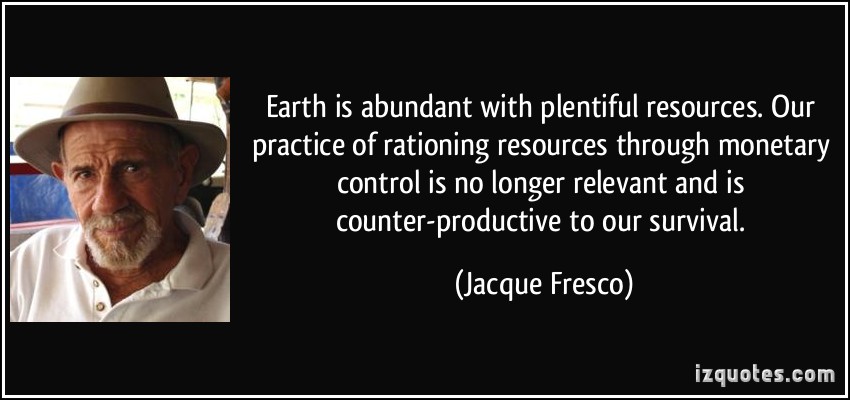 Earth is abundant with plentiful resources. Our practice of rationing resources through monetary control is no longer relevant and is counter-productive to our survival.