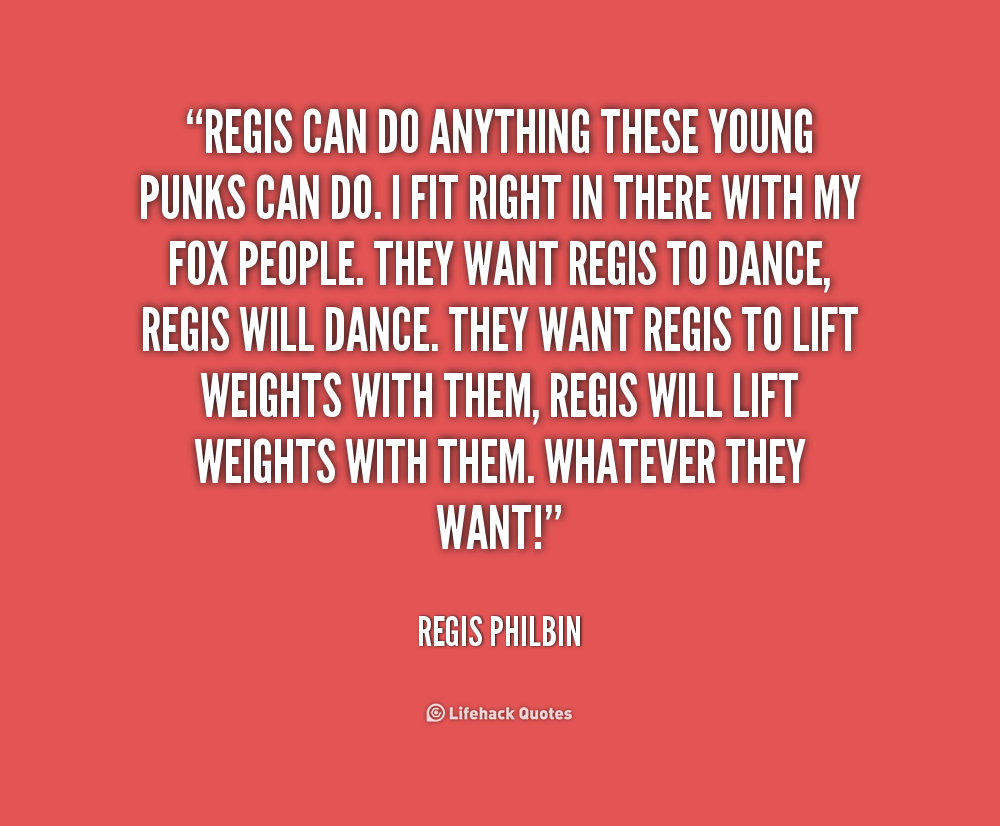 Regis Francis Xavier Philbin is an American media personality, actor and singer, known for hosting talk and game shows since the 1960s. Sometimes called "the hardest working man in show business", he holds the Guinness World Record for the most time spent in front of a television camera. His trademarks include his excited manner, his Bronx accent, his wit, and his irreverent ad-libs... (wikipedia)