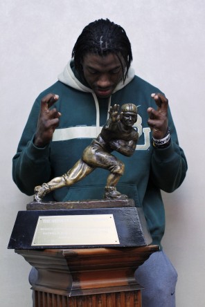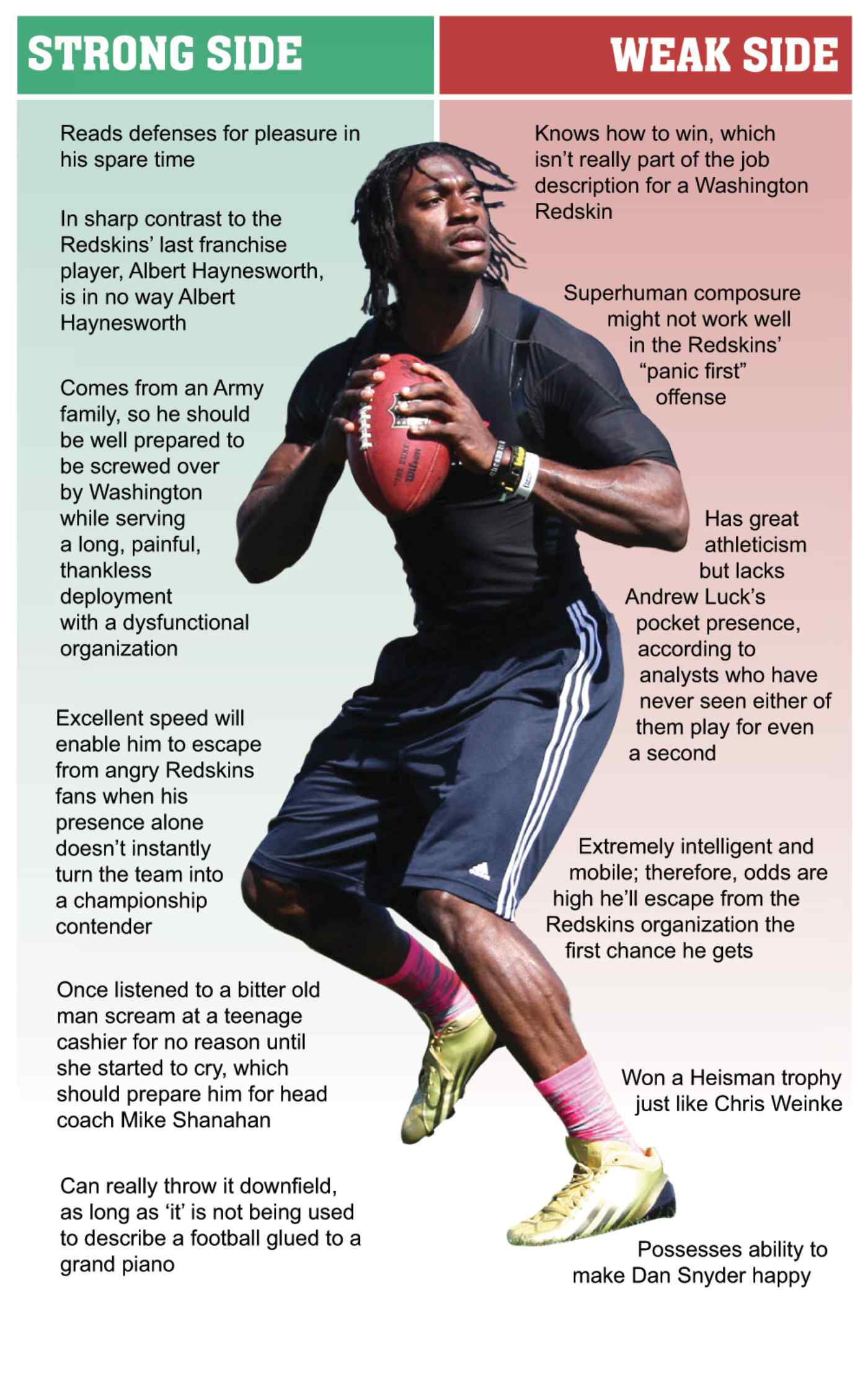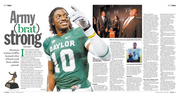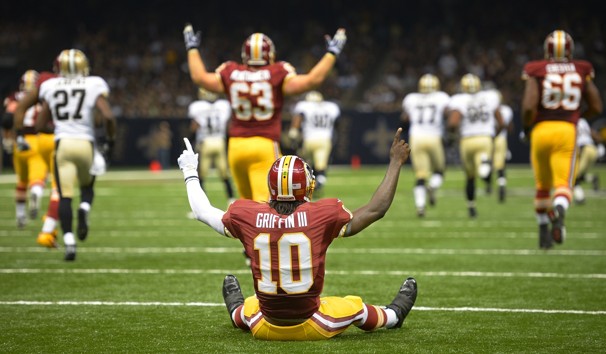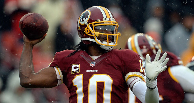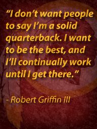 Robert Lee Griffin III, nicknamed RG3, is an American football quarterback for the Washington Redskins of the National Football League. He played college football at Baylor, where he won the 2011 Heisman Trophy, and was drafted by the Redskins second overall in the 2012 NFL Draft. Griffin won the 2012 NFL Offensive Rookie of the Year award... (wikipedia)