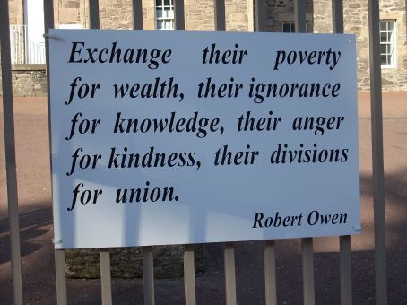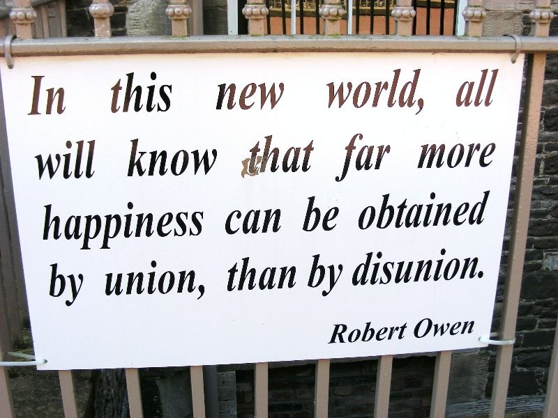 Robert Owen was a Welsh social reformer and one of the founders of utopian socialism and the cooperative movement. In 1824, Owen travelled to America to invest the bulk of his fortune in an experimental 1,000-member colony on the banks of Indiana's Wabash River, called New Harmony. New Harmony was intended to be a Utopian society. Before travelling to America, he was an industrialist in Scotland... (wikipedia)