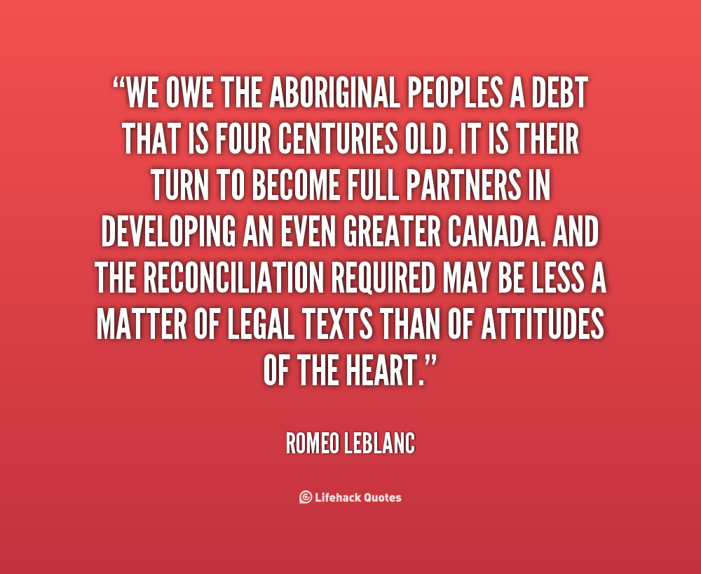 We owe the Aboriginal peoples a debt that is four centuries old. It is their turn to become full partners in developing an even greater Canada. And the reconciliation required may be less a matter of legal texts than of attitudes of the heart.