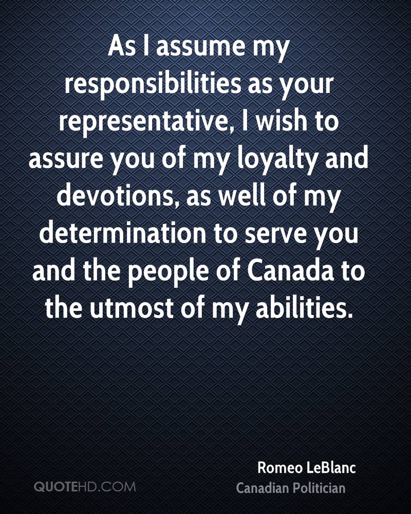 As I assume my responsibilities as your representative, I wish to assure you of my loyalty and devotions, as well of my determination to serve you and the people of Canada to the utmost of my abilities.