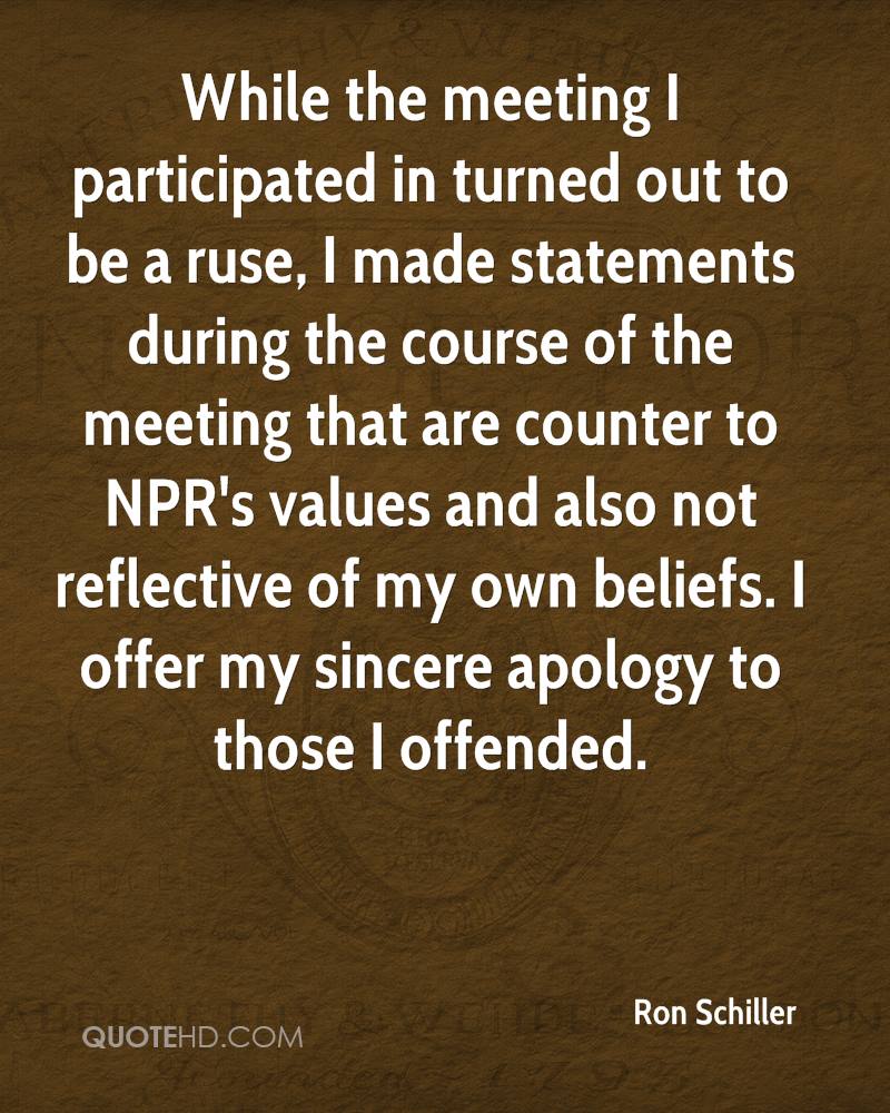 While the meeting I participated in turned out to be a ruse, I made statements during the course of the meeting that are counter to NPR's values and also not reflective of my own beliefs. I offer my sincere apology to those I offended.