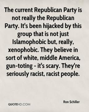 The current Republican Party is not really the Republican Party. It's been hijacked by this group that is not just Islamophobic but, really, xenophobic. They believe in sort of white, middle America, gun-toting - it's scary. They're seriously racist, racist people.