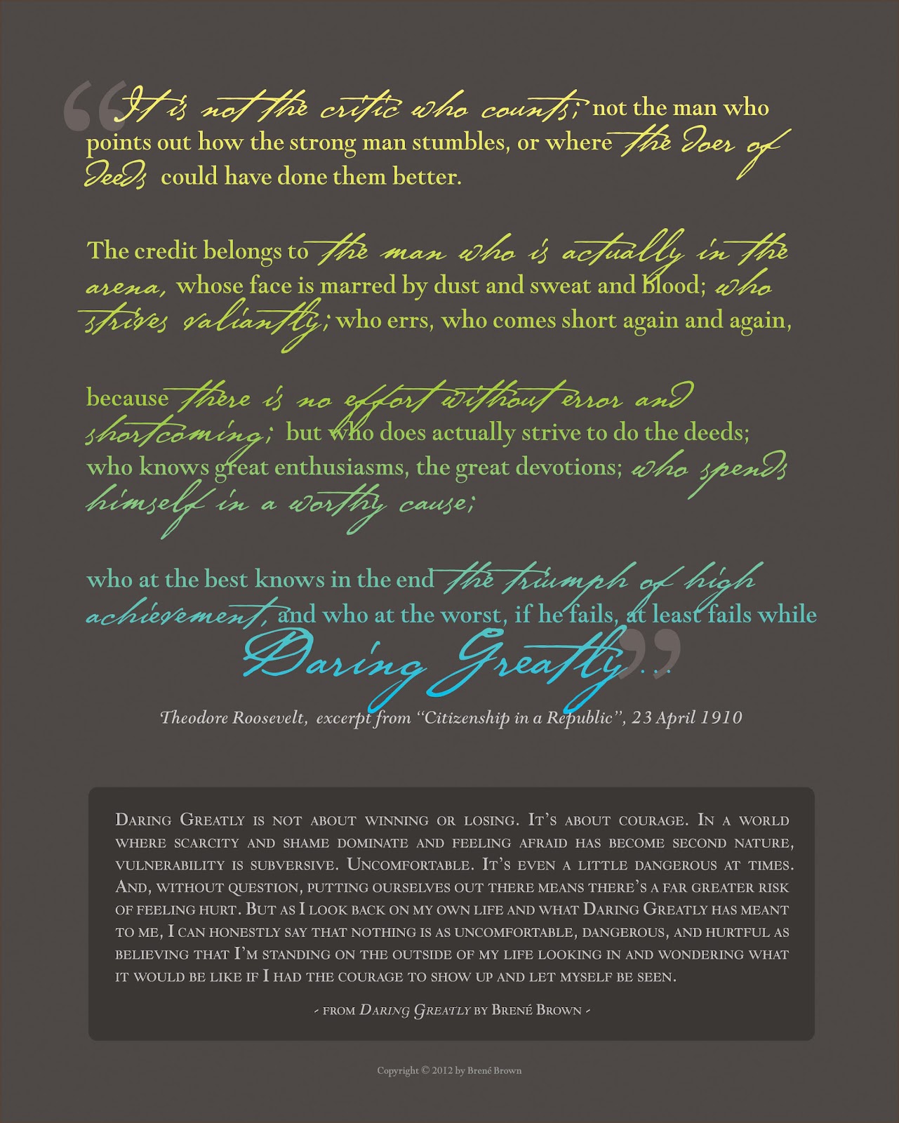 Brené Brown is an American scholar, author, and public speaker, who is currently a research professor at the University of Houston Graduate College of Social Work. Over the last twelve years she has been involved in research on a range of topics, including vulnerability, courage, worthiness, and shame. She is the author of two #1 New York Times Bestsellers: The Gifts of Imperfection and Daring Greatly. She and her work have been featured on PBS,NPR,TED, and CNN... (wikipedia)