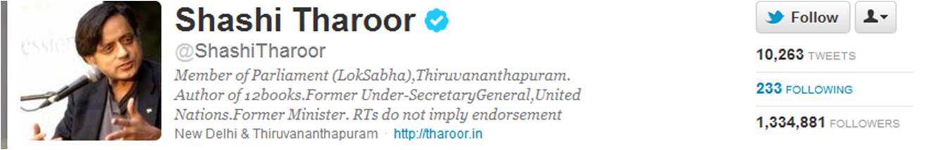 Shashi Tharoor is an Indian politician, writer, public intellectual and former diplomat who has served as Member of Parliament from Thiruvananthapuram, Kerala since 2009. He was previously Minister of State in the Government of India for External Affairs and Human Resource Development. He is a member of the Indian National Congress and served as an official spokesperson for the party from January to October 2014. Until 2007 he was a career official at the United Nations, rising to the rank of Under-Secretary General for Communications and Public Information in 2001. After 29 years within the UN, Tharoor announced his departure after finishing second in the 2006 elections for the Secretary-General to Ban Ki-moon... (wikipedia)
