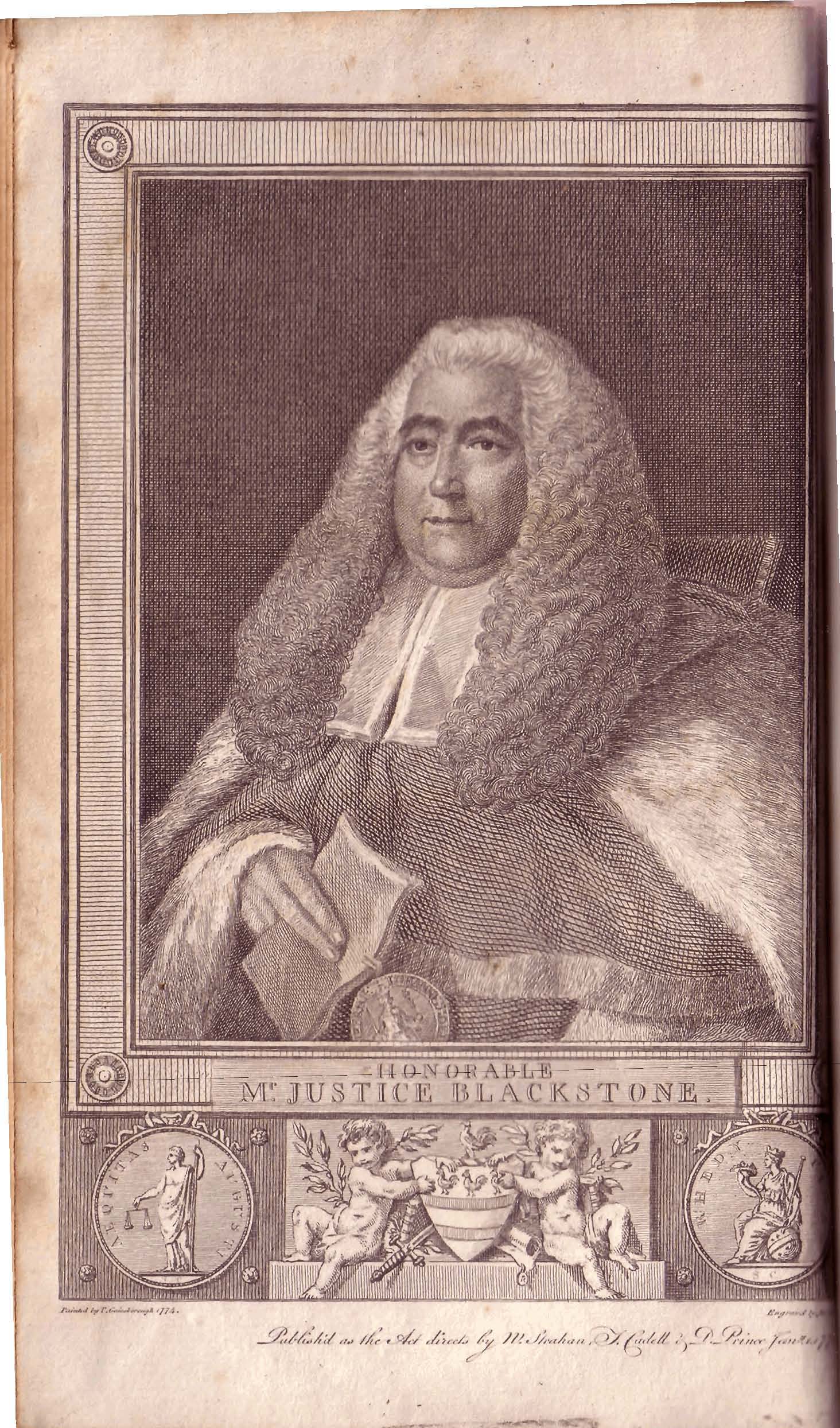 Sir William Blackstone SL KC was an English jurist, judge and Tory politician of the eighteenth century. He is most noted for writing the Commentaries on the Laws of England. Born into a middle-class family in London, Blackstone was educated at Charterhouse School before matriculating at Pembroke College, Oxford in 1738. After switching to and completing a Bachelor of Civil Law degree, he was made a Fellow of All Souls, Oxford on 2 November 1743, admitted to Middle Temple, and called to the Bar there in 1746. Following a slow start to his career as a barrister, Blackstone became heavily involved in university administration, becoming accountant, treasurer and bursar on 28 November 1746 and Senior Bursar in 1750. Blackstone is considered responsible for completing the Codrington Library and Warton Building, and simplifying the complex accounting system used by the college. On 3 July 1753 he formally gave up his practice as a barrister and instead embarked on a series of lectures on English law, the first of their kind. These were massively successful, earning him a total of £453, and led to the publication of An Analysis of the Laws of England in 1756, which repeatedly sold out and was used to preface his later works... (wikipedia)