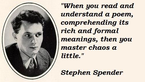 Sir Stephen Harold Spender CBE was an English poet, novelist and essayist who concentrated on themes of social injustice and the class struggle in his work. He was appointed the seventeenth Poet Laureate Consultant in Poetry to the United States Library of Congress in 1965... (wikipedia)