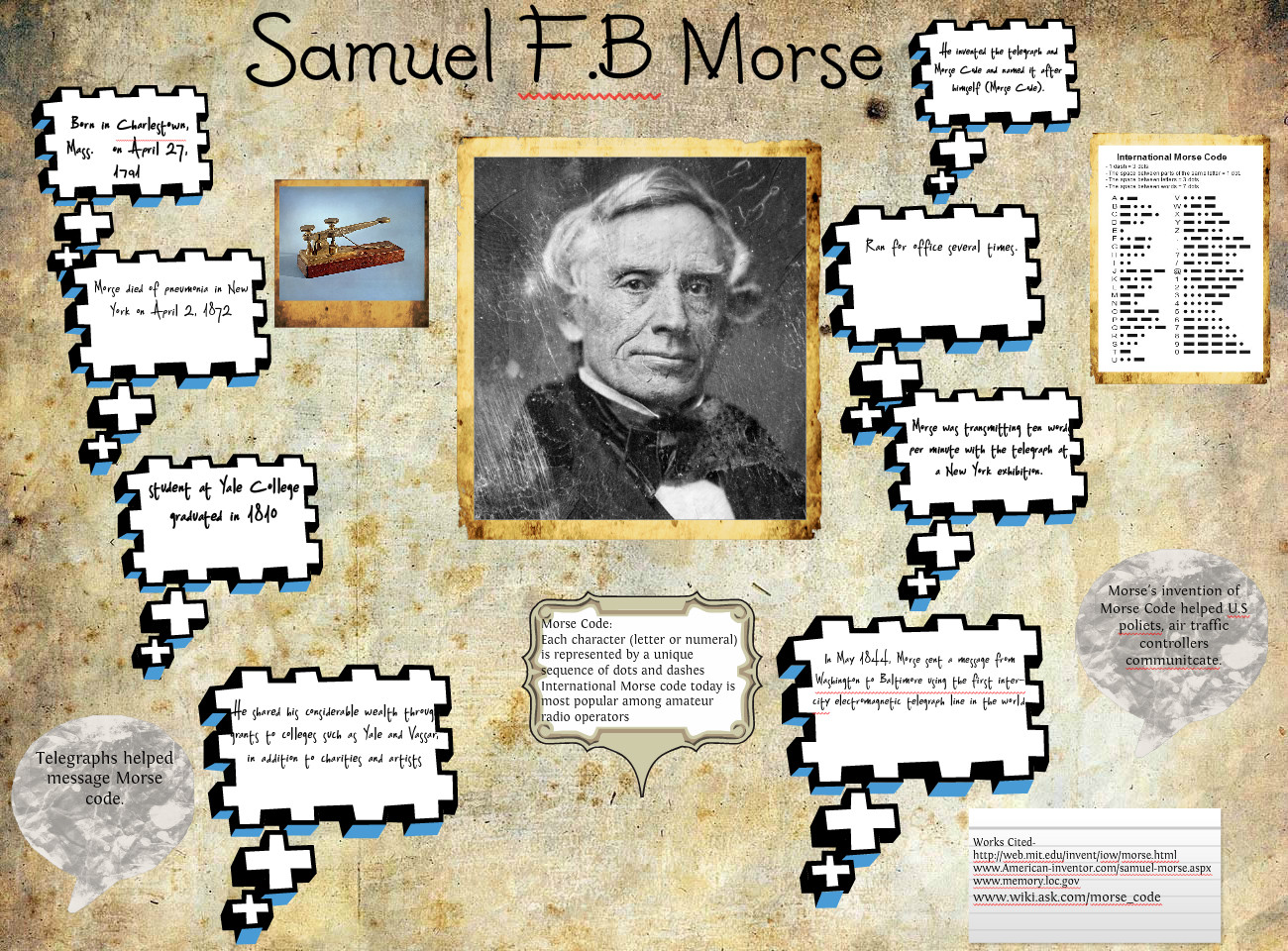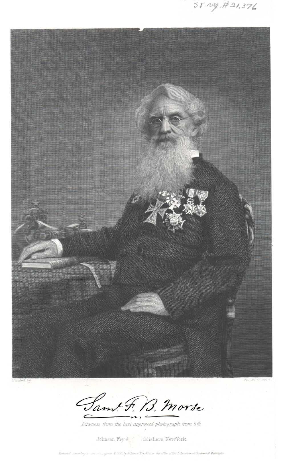 Samuel Finley Breese Morse was an American painter and inventor. After having established his reputation as a portrait painter, in his middle age Morse contributed to the invention of a single-wire telegraph system based on European telegraphs. He was a co-developer of the Morse code, and helped to develop the commercial use of telegraphy... (wikipedia)