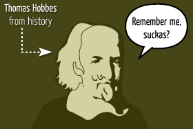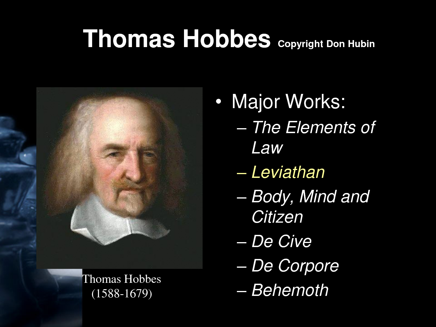 Thomas Hobbes of Malmesbury, in some older texts Thomas Hobbs of Malmsbury, was an English philosopher, best known today for his work on political philosophy. His 1651 book Leviathan established social contract theory, the foundation of most later Western political philosophy... (wikipedia)