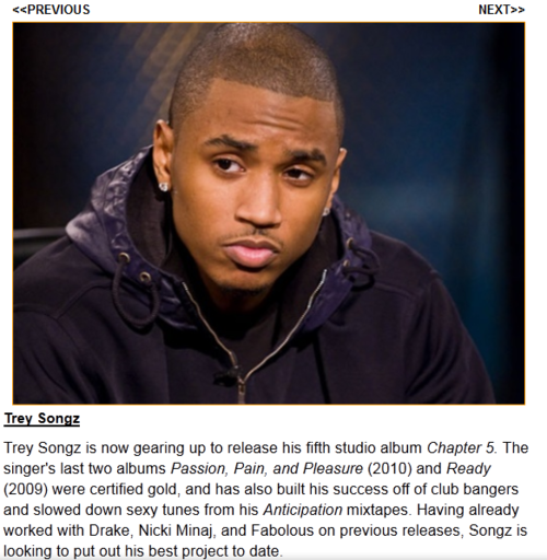Tremaine Aldon Neverson, better known as Trey Songz, is an American singer, songwriter, rapper, record producer and actor. His debut album, I Gotta Make It, was released in 2005 through Atlantic Records. His follow up album, Trey Day, spawned his first top 20 single, "Can't Help but Wait." Songz released his third album Ready in 2009 and a single from the album, "Say Aah," peaked at No. 9 on the Billboard Hot 100 making it Songz's first top 10 hit. Ready was nominated for Best Male R&B Vocal Performance at the 2008 Grammy Awards. The following year saw Songz's highest charting song to date, "Bottoms Up" featuring rapper Nicki Minaj from his fourth studio album, Passion, Pain & Pleasure... (wikipedia)