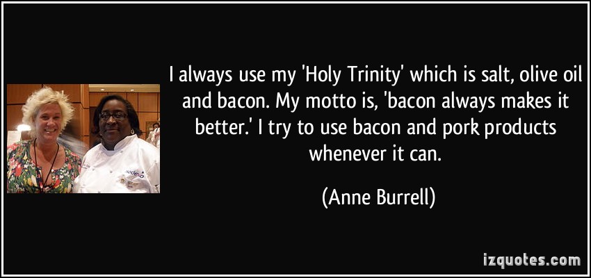 I always use my 'Holy Trinity' which is salt, olive oil and bacon. My motto is, 'bacon always makes it better.' I try to use bacon and pork products whenever it can.