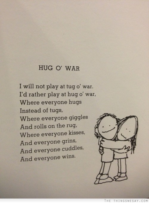 I will not play tug o' war. I'd rather play hug o' war. Where everyone hugs instead of tugs, Where everyone giggles and rolls on the rug, Where everyone kisses, and everyone grins, and everyone cuddles, and everyone wins.