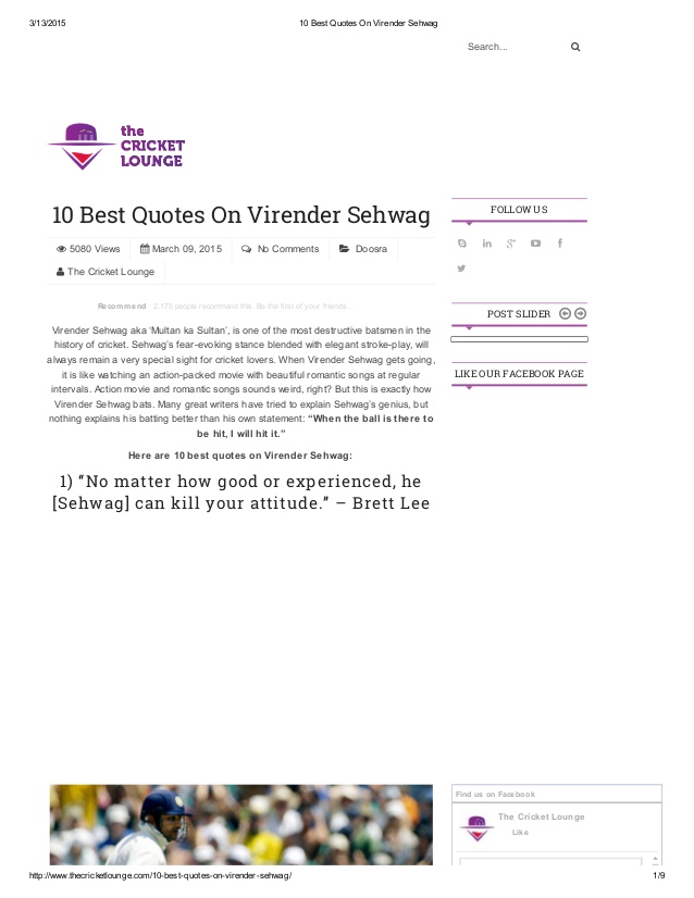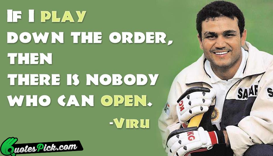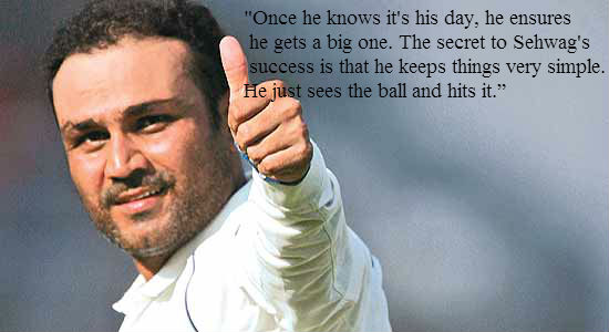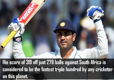 Virender Sehwag pronunciation is a former Indian cricketer. An aggressive right-handed opening batsman and a part-time right-arm off-spin bowler, he played his first One Day International in 1999 and joined the Indian Test team in 2001. In April 2009, Sehwag became the only Indian to be honoured as the Wisden Leading Cricketer in the World for his performance in 2008, subsequently becoming the first player of any nationality to retain the award for 2009... (wikipedia)
