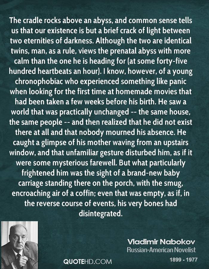 Vladimir Vladimirovich Nabokov was a Russian-American novelist. His first nine novels were in Russian, and he achieved international prominence after he began writing English prose. He was also a capable lepidopterist and chess composer... (wikipedia)