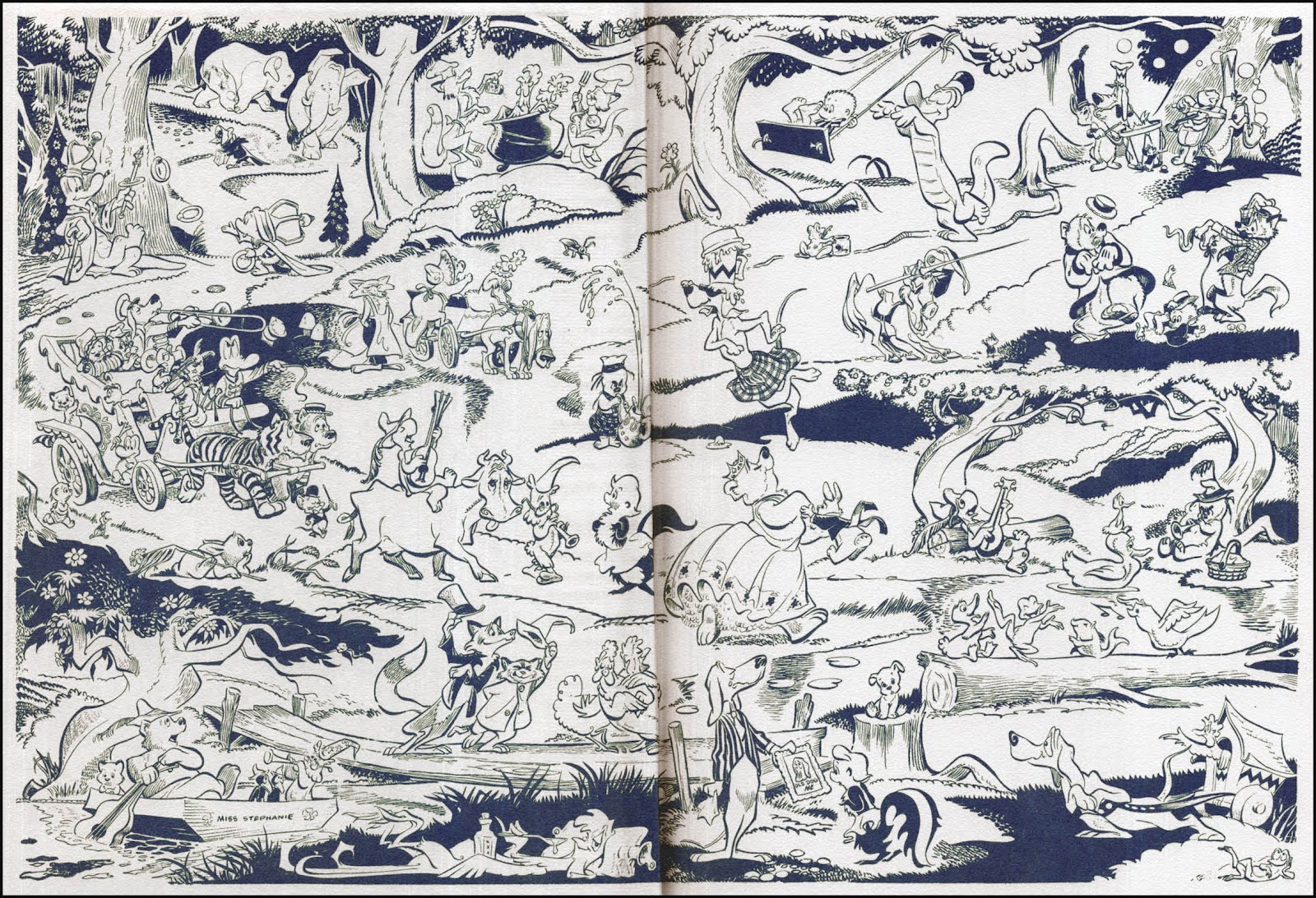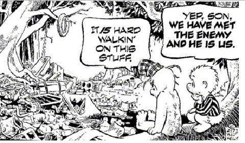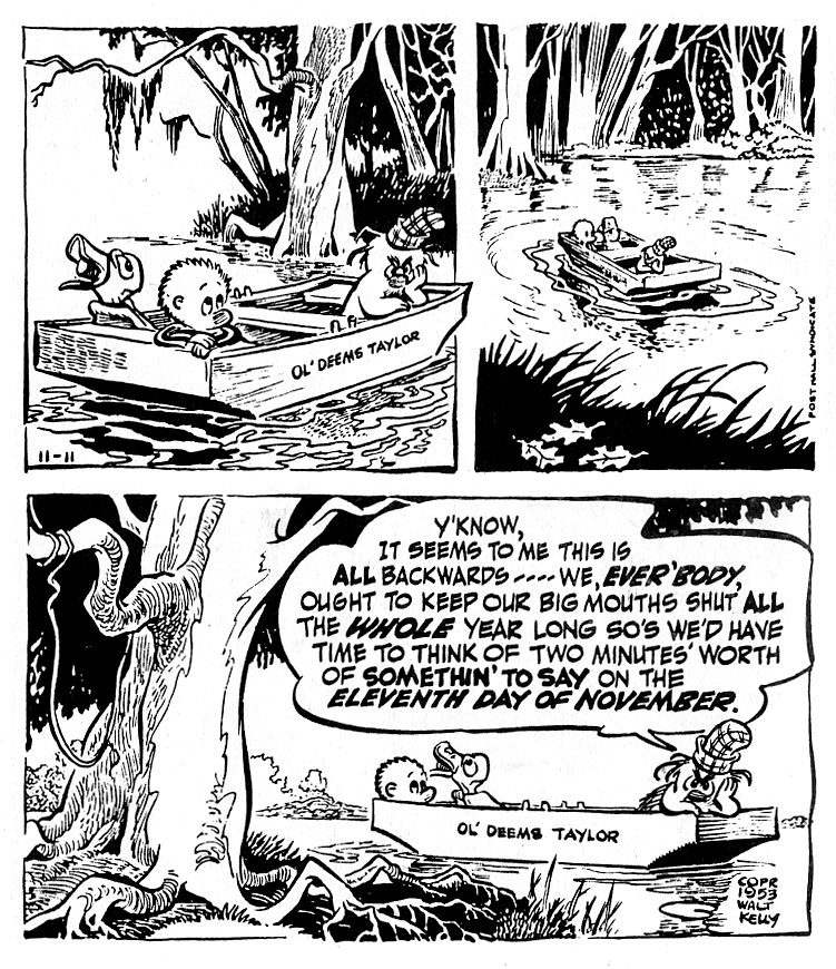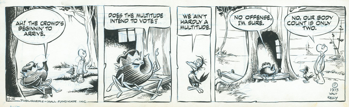Walter Crawford Kelly, Jr. or Walt Kelly, was an American animator and cartoonist, best known for the comic strip Pogo. He began his animation career in 1936 at Walt Disney Studios, contributing to Pinocchio, Fantasia, and Dumbo. Kelly resigned in 1941 at the age of 28 to work at Dell Comics, where he created Pogo, which eventually became his platform for political and philosophical commentary... (wikipedia)