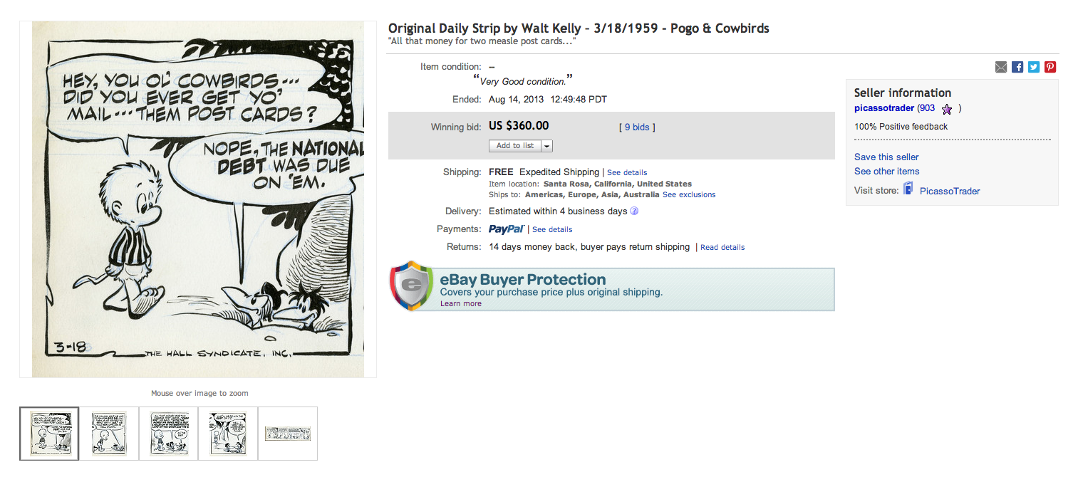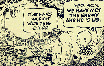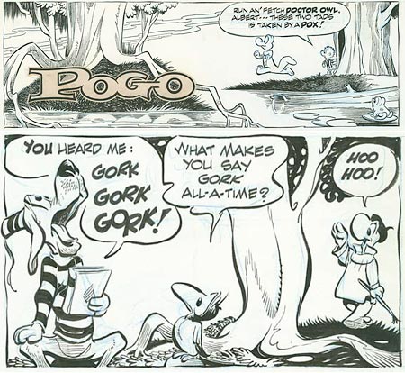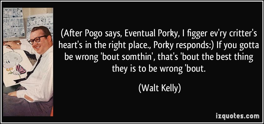 Walter Crawford Kelly, Jr. or Walt Kelly, was an American animator and cartoonist, best known for the comic strip Pogo. He began his animation career in 1936 at Walt Disney Studios, contributing to Pinocchio, Fantasia, and Dumbo. Kelly resigned in 1941 at the age of 28 to work at Dell Comics, where he created Pogo, which eventually became his platform for political and philosophical commentary... (wikipedia)